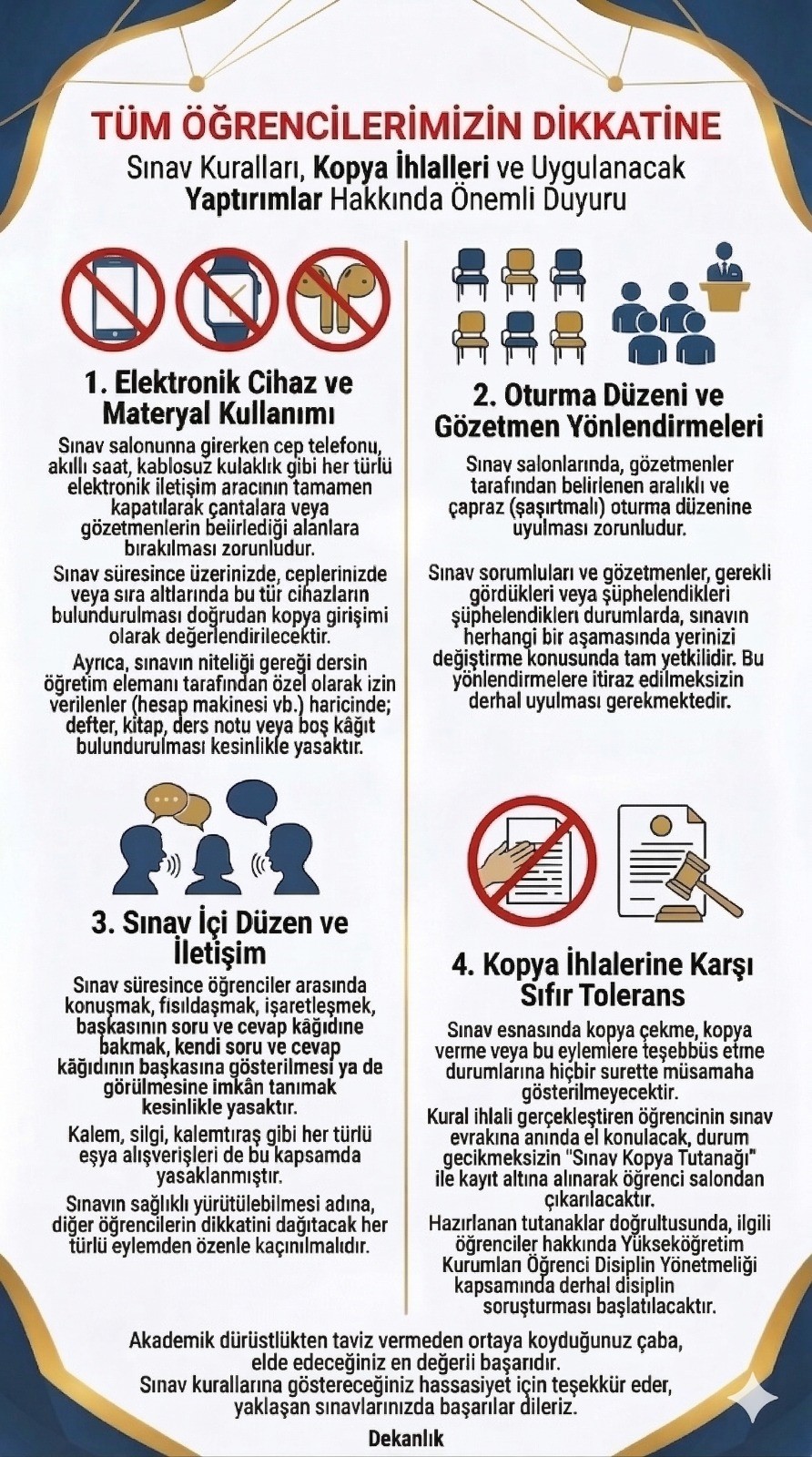 Fakültemizde devam eden ve önümüzdeki süreçte yapılacak tüm sınavlarda, sınavların adil, düzenli ve sağlıklı bir şekilde yürütülebilmesi amacıyla Dekanlığımız tarafından sınav kurallarına ilişkin önemli bir bilgilendirme yayımlanmıştır.