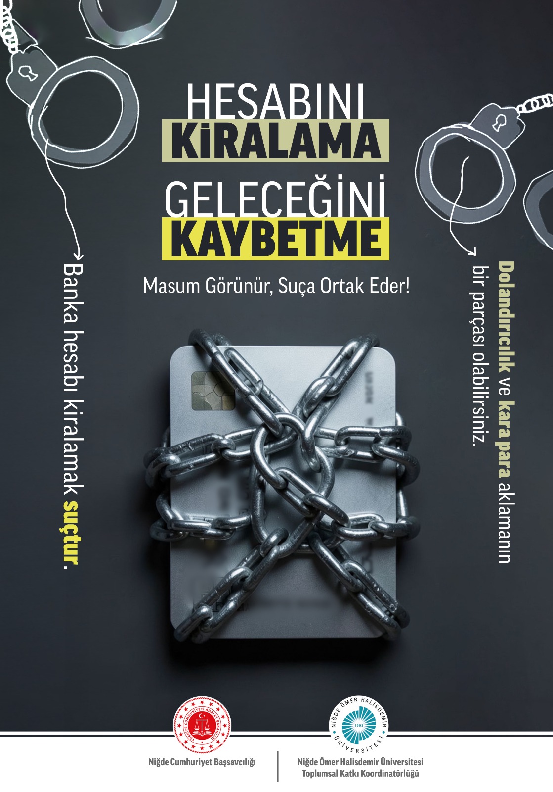 Üniversite öğrencilerine yönelik bilgilendirme ve farkındalık çalışmaları kapsamında, “Hesabını Kiralama, Geleceğini Kaybetme” başlıklı bilgilendirme semineri düzenlendi. Haftanın İlk ders saatinde gerçekleştirilen sunumla, öğrencilerin banka hesaplarını kiralamaları ya da üçüncü kişilerin kullanımına izin vermeleri halinde karşılaşabilecekleri hukuki, adli ve mali sonuçlar hakkında bilgilendirilmesi amaçlandı.